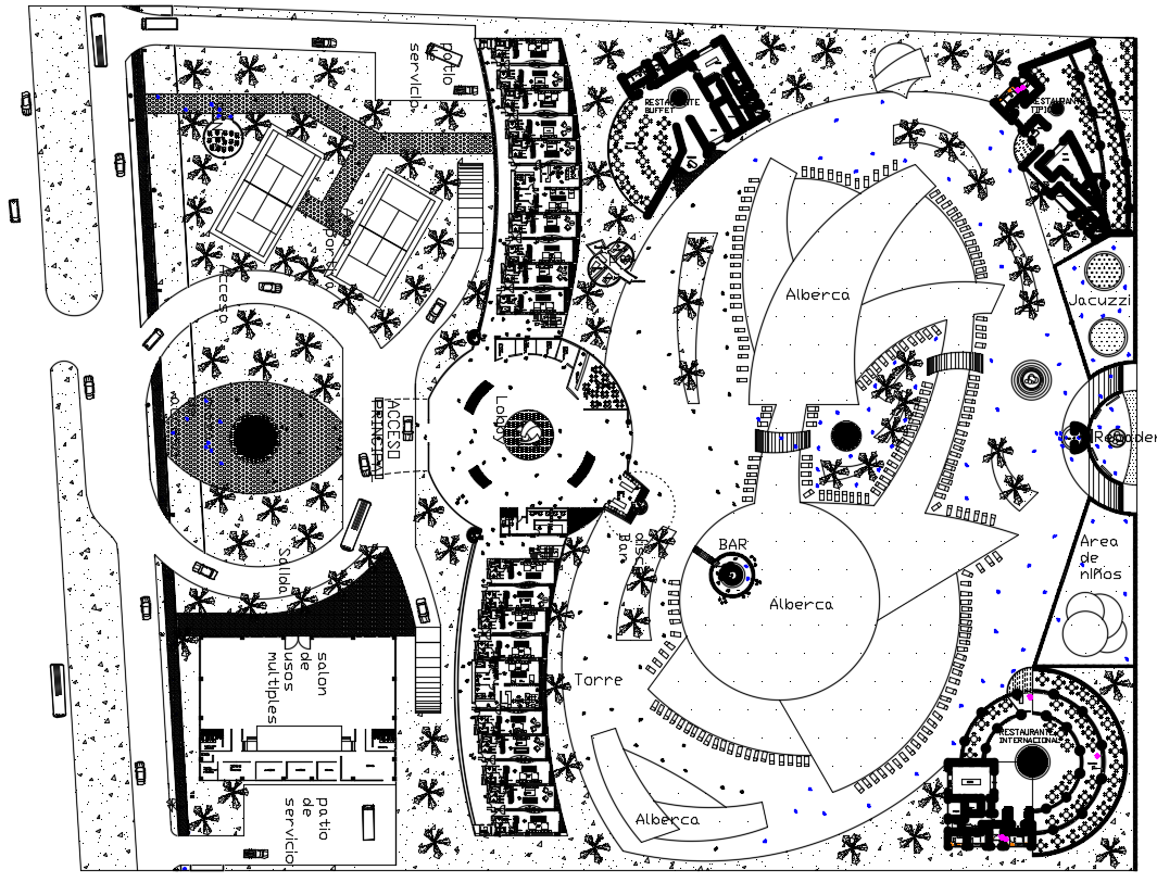 the architecture 5 star hotel project CAD drawing that shows sports game play ground, specific master bedrooms, bar counter, 3 types of restaurant such as international, buffet, typical restaurant, salon massage room, compound wall and beautiful landscaping design. Thank you for downloading the AutoCAD file and other CAD program from our website.