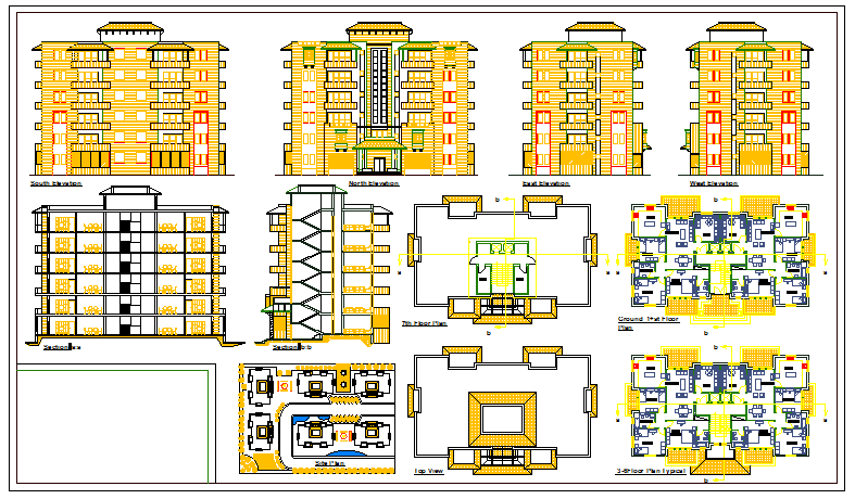 This is a Typical plan detail of multi storey residential house design drawing included site plan, Typical plan, Section drawing ,Elevation drawing, top view, terrace floor all design in this auto cad drawing.