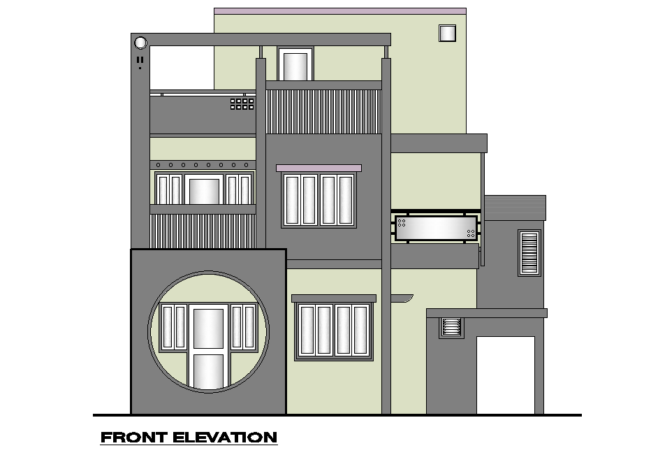Front elevation drawing of bungalow detail specified in this AutoCAD file. this file consists of G + 2-floor plan drawing with door window detail and one circular openable window given in this file. this can be used by architects and engineers. Download this 2d AutoCAD drawing file.
