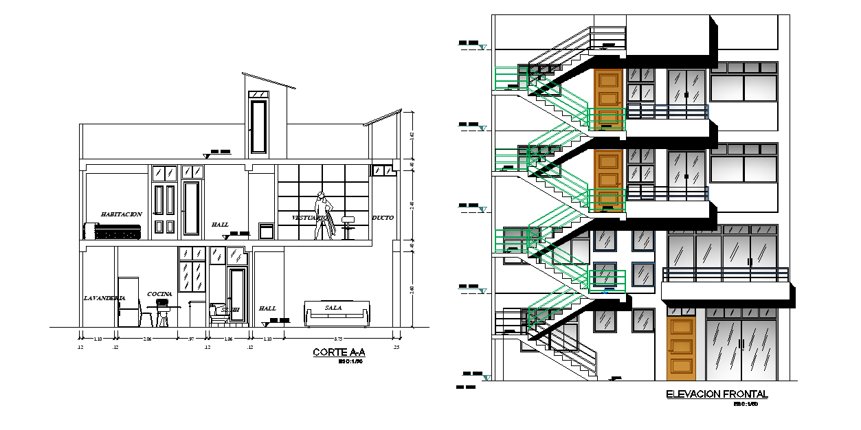Apartment section detail drawing defined in this AutoCAD file. this file consists of section detail for bungalow drawing with furniture detail and staircase detail given in this file. this can be used by architects and engineers. Download this 2d AutoCAD drawing file.
