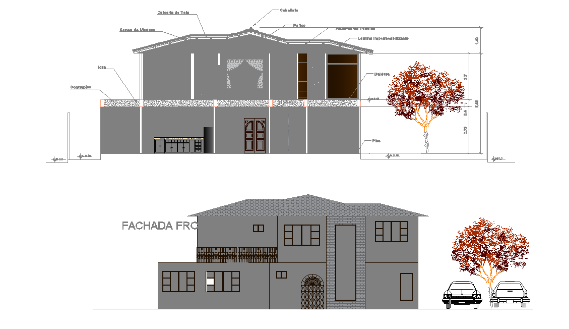 Bungalow sectional elevation detail drawing specified in this AutoCAD file. in this file, G + 1 floor of housed design given with door window detail drawing with staircase detail and balcony detail drawing plan presented in this file. this can be used by architects and engineers. Download this 2d AutoCAD drawing file.