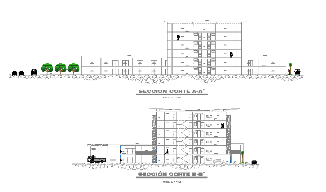 Section detail drawing of the hotel presented in this AutoCAD file. this file consists of front and back elevation with services and utilities detail drawing given with dimensions and specifications in this file. this can be used by architects and engineers. Download this 2d AutoCAD drawing file.
