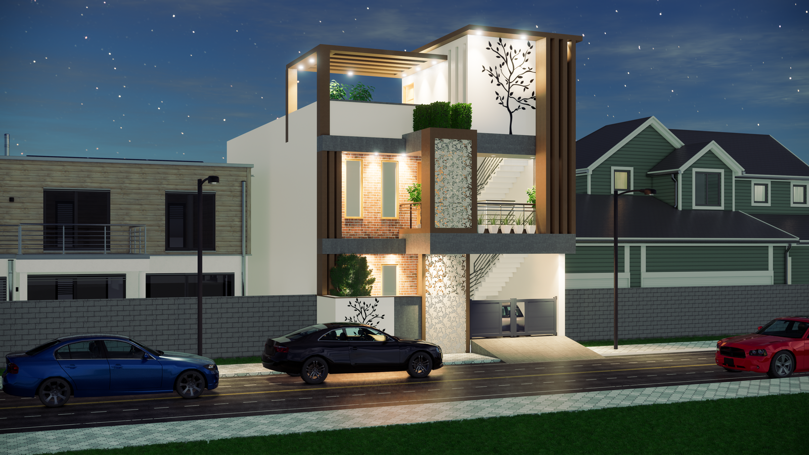 Wonderful 3d house design elevation Revit drawing file is given here. Beautiful triple storey house elevation is given. The front elevation, night mode design with lightings, and side pergola design look awesome. This drawing is useful for the people who searching for house elevation ideas, civil engineers, and architects. you can Download this drawing Revit file on cadbull.com.
