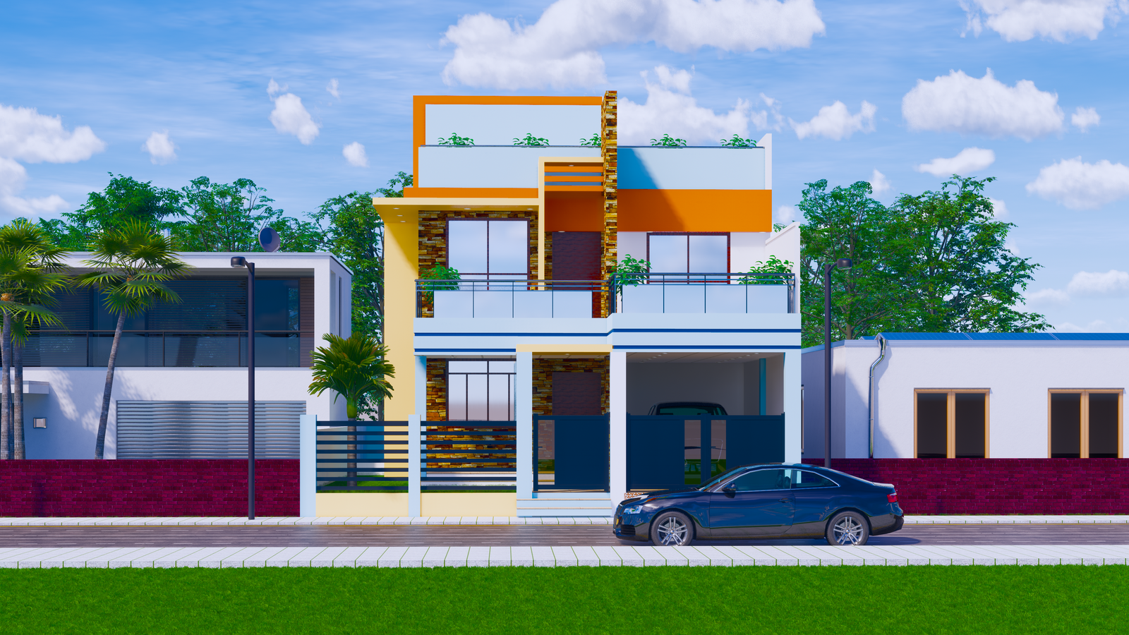 Wonderful G+1 3d house elevation design Revit file. download the Revit file on cadbull.com.