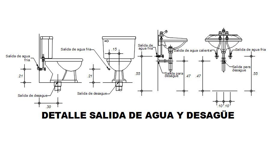 Water outlet detail is given in this 2D Autocad drawing file. Water drain detail is given. Cold water outlet, hot water outlet, drain outlet, and other details are given. Thank you for downloading the 2D Autocad files and other CAD program files from our website.