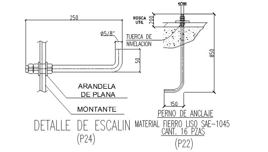 Detail of escalin is given in this Autocad DWG drawing file. Anchor bolt material smooth iron sae-1045 qty. 16 pcs are provided in this structure. Washer flat, leveling nut, thread, and measurements are given. For more details download the 2D Autocad drawing file. Thank you for downloading the 2D Autocad files and other CAD program files from our website.