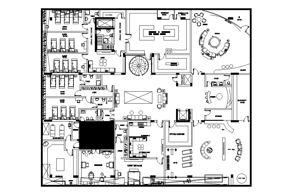 The ground floor plan of the corporate office building presented in this 2D AutoCAD file. Download the AutoCAD file.