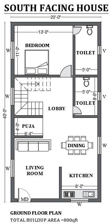 20’x40’ FREE south-facing home as per Vastu shastra is given in this Autocad drawing file. The total built-up area of the plan is 800sqft. In this floor plan master bedroom with attached toilet, living room, kitchen, dining room, lobby, puja, and common toilet is available .download this 2D Autocad drawing file.