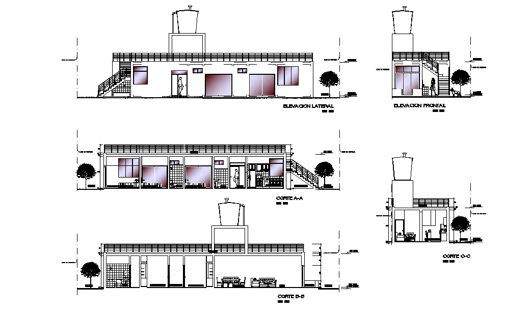 Elevation view of 20x6m beach house plan is available in this Autocad drawing file. Download the 2D Autocad file.
