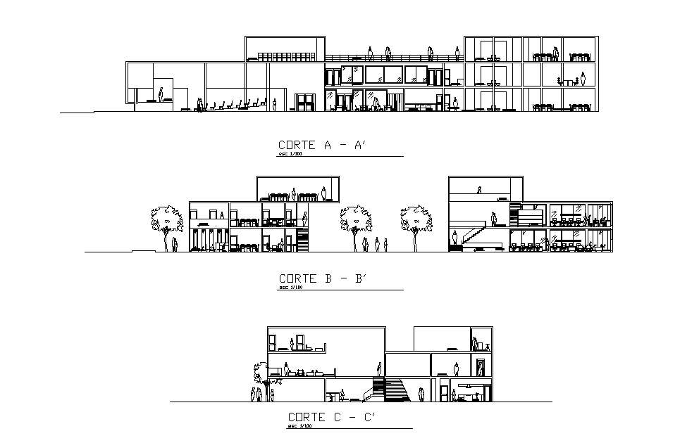 Corte of the corporate building is given in this Autocad drawing file. Download the 2D Autocad file.