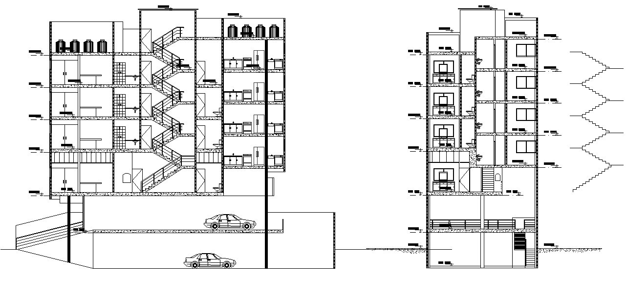 Section view of 30x10m apartment building plan is given in this Autocad drawing model. This is G+4 residential building. The length and breadth of the plan is 30m and 10m respectively. In each floor two houses are available. These plans car parking, consists of living area, kitchen, dining, bedroom with attached toilet, common toilet, kid’s room with attached toilet are available. For more details download the 2D Autocad drawing file. Thank you for downloading the Autocad files and other CAD program files from our website.