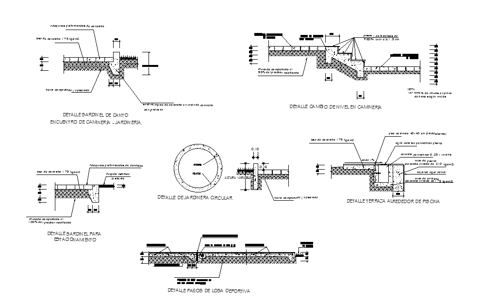 Structure component section details are given in this Autocad drawing file. Detail of circular plan is given. Sardinel detail for parking, details of sports slab cloth, terrace detail around the pool, details of change of level in walking, sardinel detail of canto encounter of walking – gardening and other details are given in this Autcad drawing model. For more details download the 2D Autocad drawing file. Thank you for downloading the Autocad files and other CAD program files from our website.