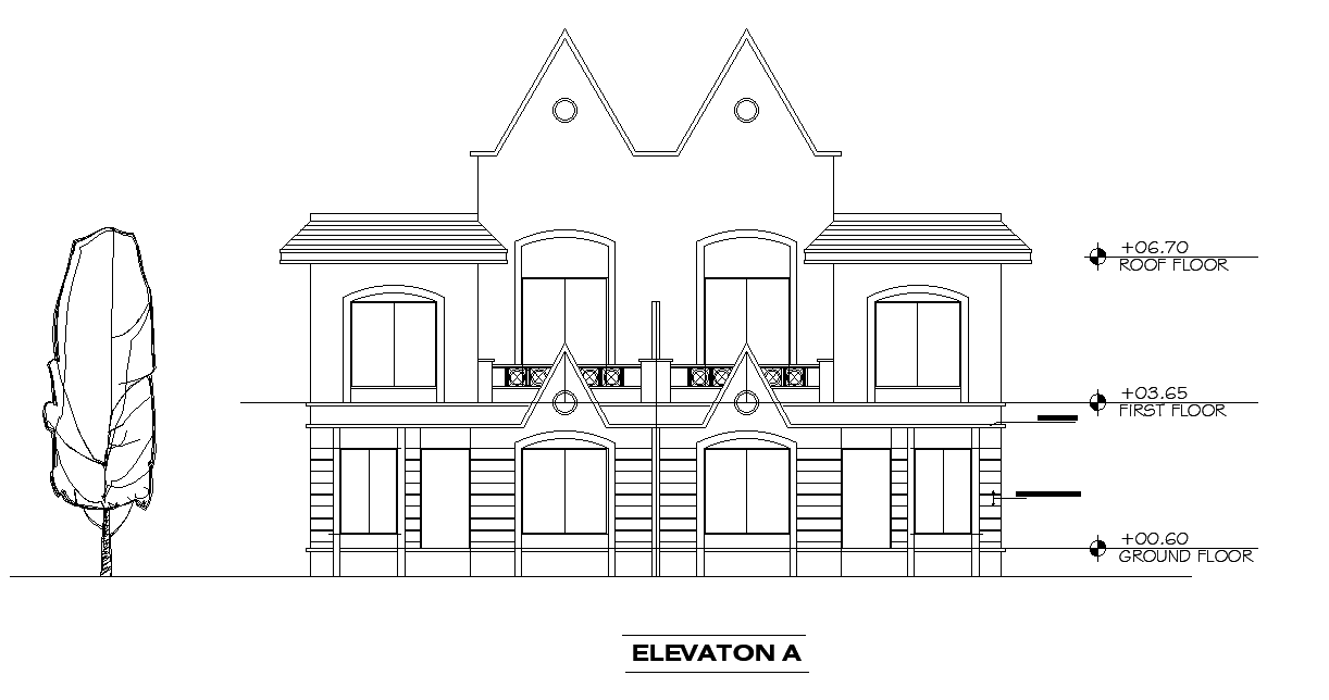 Twin bungalow Elevation of the house plan is available in this Autocad drawing model. Front elevation details are given. In this drawing tree, main door, windows, and other details are given. Download the 2D Autocad drawing file. Thank you downloading the 2D AutoCAD DWG drawing file and other CAD program files from our website.