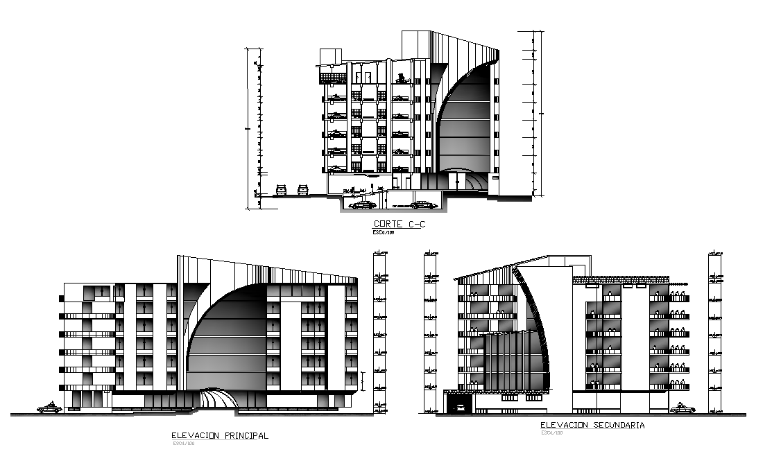 Hotel Building Section and Elevation DWG Drawing File