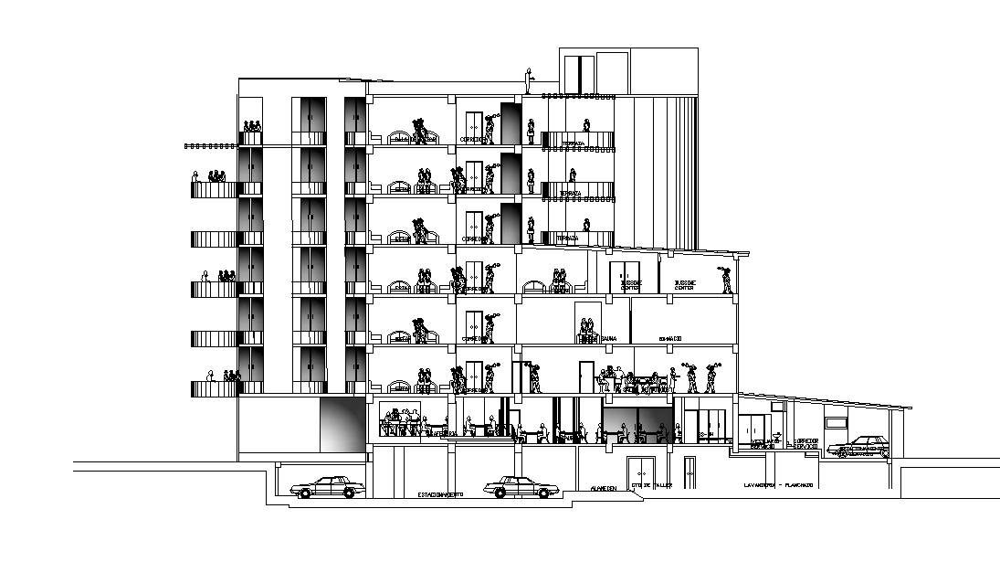 Section view of the hotel building is available in this Autocad drawing model. Download the Autocad 2D drawing file.