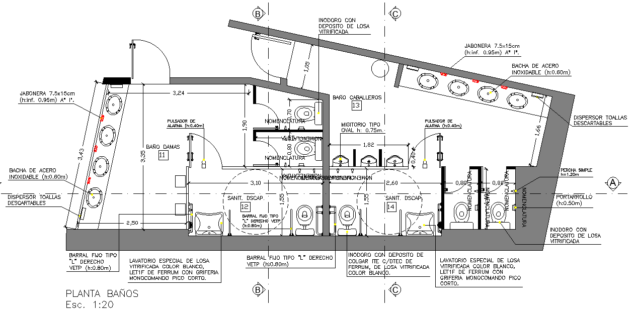 Bano details are given in this 2d autocad dwg drawing file. Material details are given. In this drawing alarm button, ladies bathroom, gentleman bathroom, special lavatory of white vitrified slab, let1f of ferrum with tap only commanding short spout, toilet with hanging tank ite c / dtec de ferrum, white glassed slab, toilet with vitrified tile tank, disposable towel disperser and other details are given. Download the 2D Autocad drawing file. Thank you for downloading the Autocad drawing file and other CAD programs from our website.