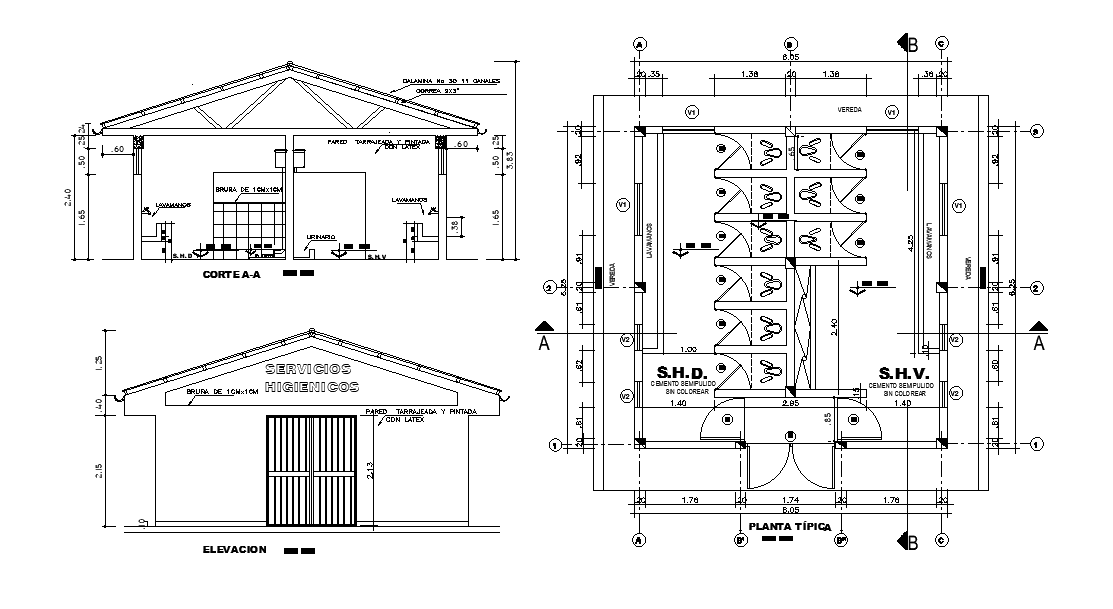 6x6m sanitary details are given in this 2D Autocad drawing file. In this plan, section and elevation details are given. Sanitary facilities are given. Height of the building is 2.40m up to roof level. Total height of the building is 3.83m. Download the 2D Autocad drawing file. Thank you for downloading the Autocad drawing file and other CAD programs from our website.