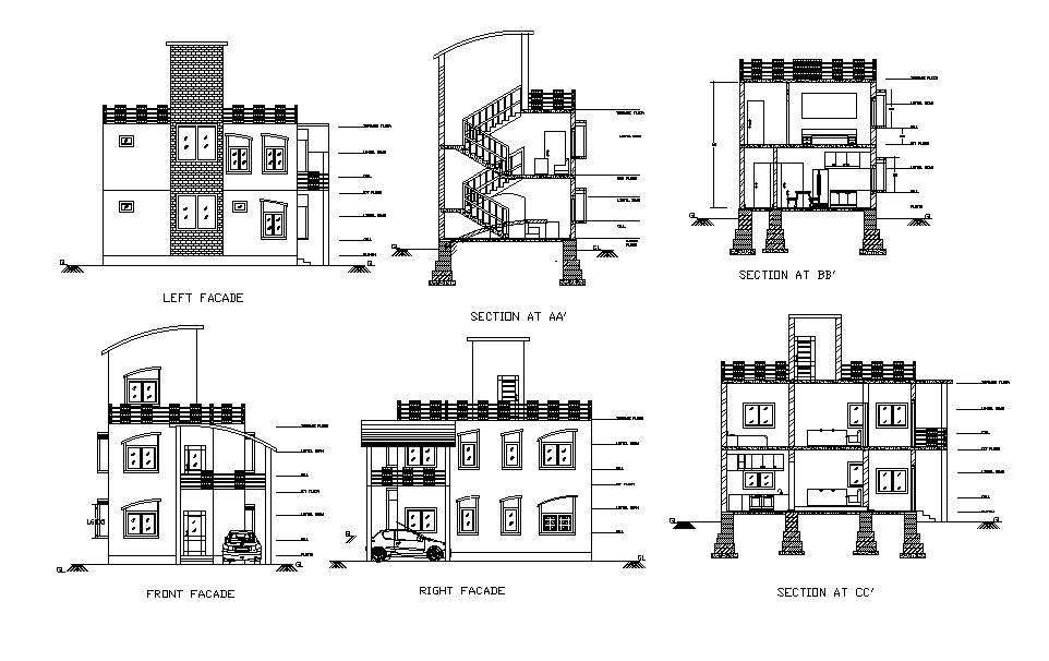 9x12m home section view is given in this Autocad drawing file. Total height of the building is 6m. This is G+1 house building. In this section footing details, staircase, slab concrete and floor levels are mentioned. Front, left and right side elevations are given in this model. Car parking is available in this plan. Download the 2D Autocad drawing file. Thank you for downloading the Autocad drawing file and other CAD programs from our website.