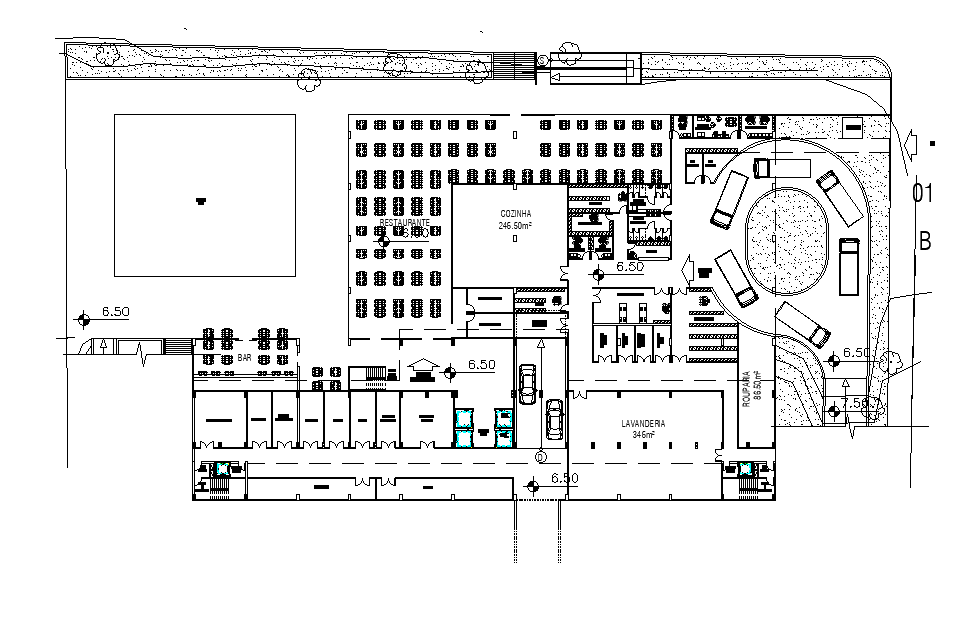 The hotel project AutoCAD drawing that shows ground floor plan with furniture layout design which consist wide restaurant with dining area, kitchen, food transportation truck, admin office and reception area. Thank you for downloading the AutoCAD file and other CAD program from our website.
