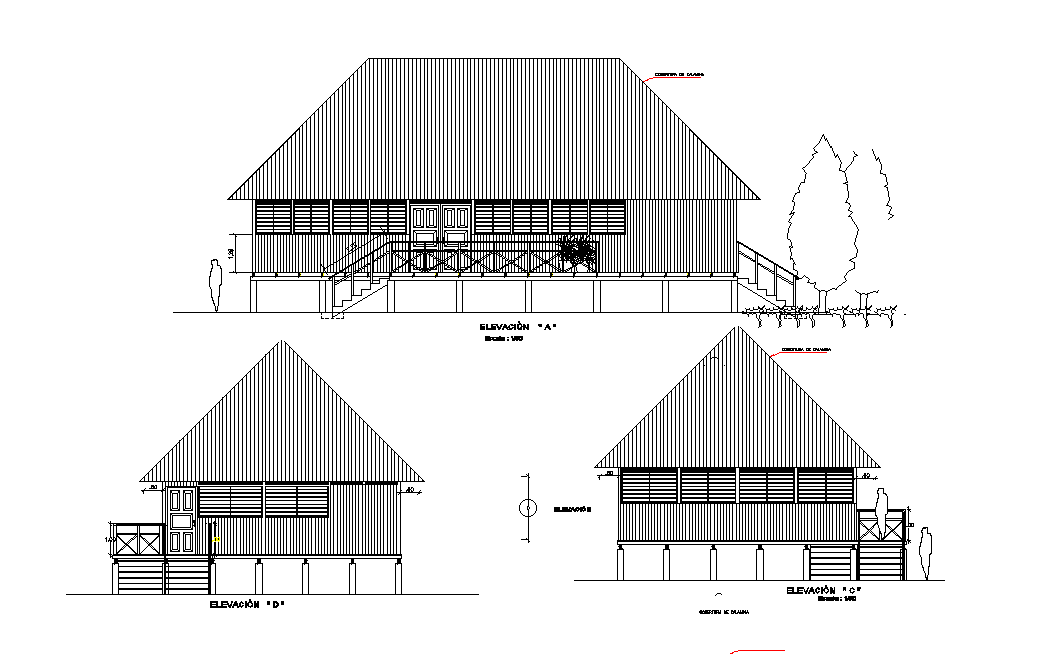 Wooden House section detail drawing provided in this file. this file consists of the residence house roof section floor plan, front and rear elevation design with dimension details in AutoCAD format. download AutoCAD file of wooden house CAD drawing and learn this CAD plan.