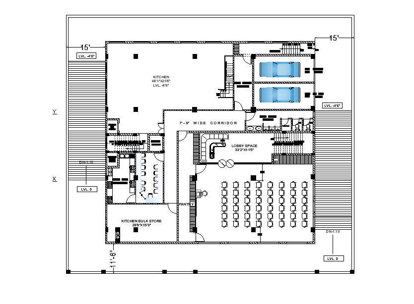 Conference hall floor plan detail drawing specified in this AutoCAD file. this file consists of parking detail, main hall detail given with services, and utility detail plan given with dimension and specification. this can be used by architects and engineers. Download this 2d AutoCAD drawing file.
