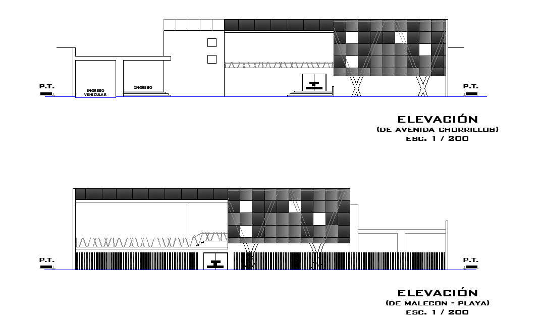 Elevation of the Dance club house plan is given in this Autocad drawing file. This is G+1 club house. In this club house car parking, warehouse alchohol, warehouse refreshment, warehouse food area, multipurpose warehouse, bar, kitchen, departure of emergency, dance floor, admin office, contador, rest room for male and female, camerino, meeting room and other details are given in this Autocad drawing model. For more details download the drawing file. Thank you for downloading the Autocad drawing file and other CAD programs from our website.