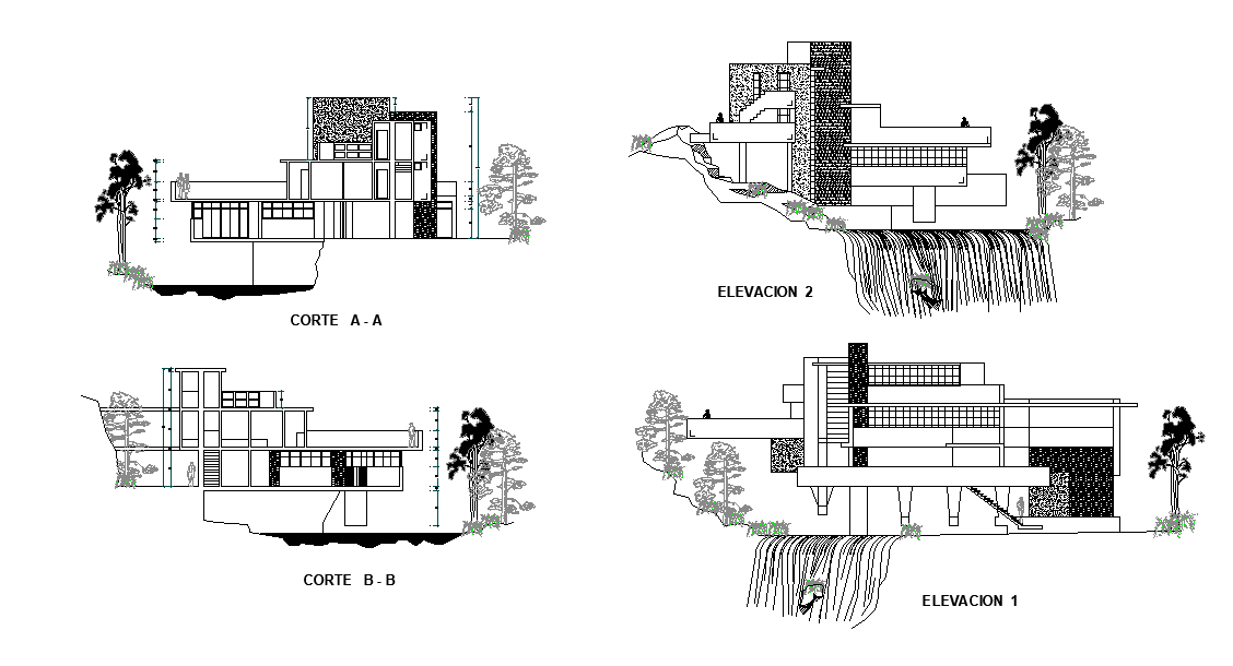 Elevation of falling water is given in this Autocad drawing file. Section view is given in this drawing. Total height of the falling water is 10m. Total height of the building is 8.4m. Tress are mentioned in this drawing model. For more details download the drawing file. Thank you for downloading the Autocad drawing file and other CAD programs from our website.