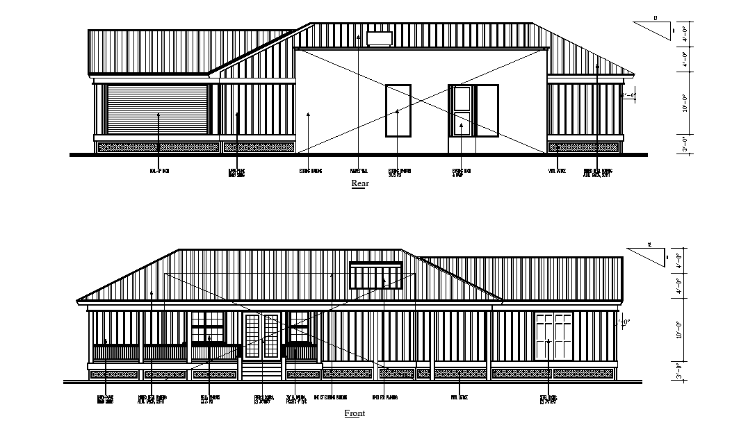 Rear and front elevation of the building is given in this Autocad drawing model. Total height of the building is 20’. In this elevation parapet wall, roll up door, hardi plank RB&B siding, existing building, existing door & ramp, existing windows, vinyl lattice, ribbed metal roofing aluminium, fascia, soffit, pella windows, French doors, steel doors, and open for planting details are given in this drawing. For more details download the drawing file. Thank you for downloading the Autocad drawing file and other CAD programs from our website.