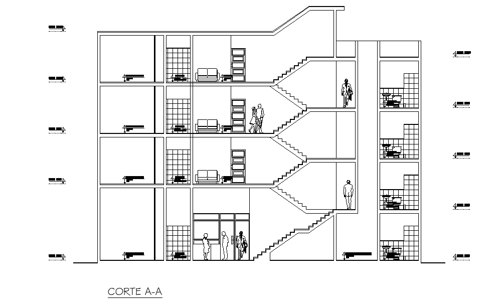 Hotel building front detail section presented in this AutoCAD drawing file. in this file, the ground floor restaurant and st to3rd floor have bedrooms with an attached toilet and staircase with dimension detail. Thank you for downloading the AutoCAD file and another CAD program from our website.