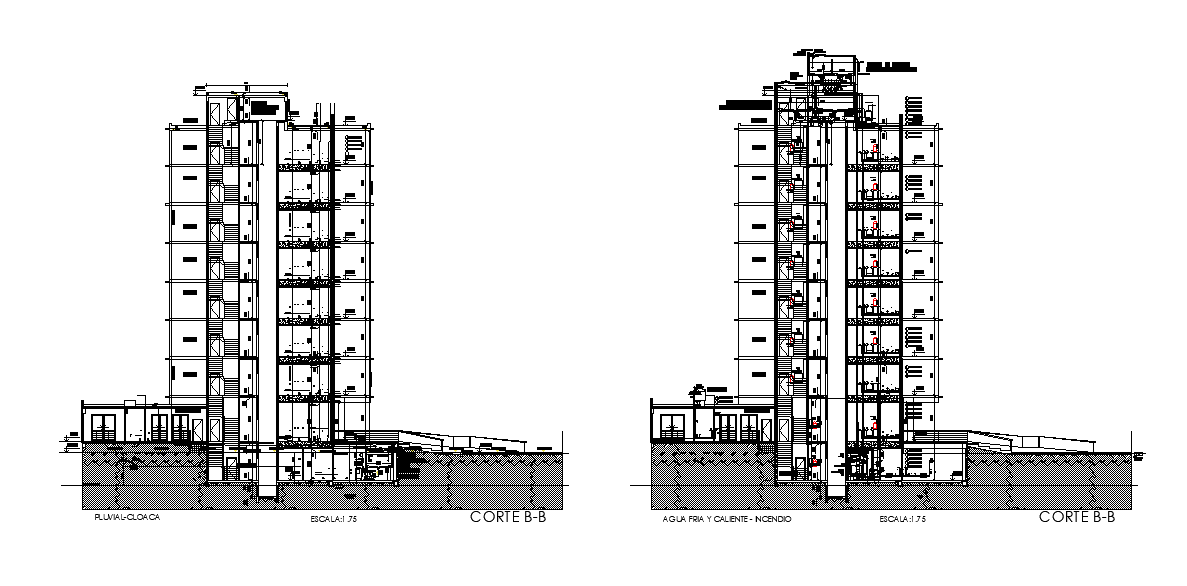 Section detail of the hotel building drawing stated in this AutoCAD file. Download the AutoCAD file.