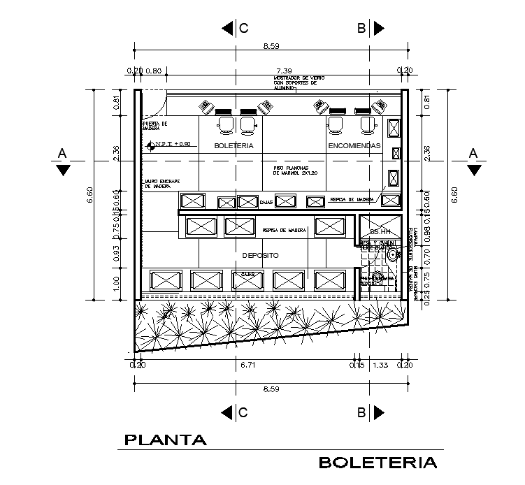 9x6m ticket office plan is given in this autocad drawing file. Download the Autocad file.