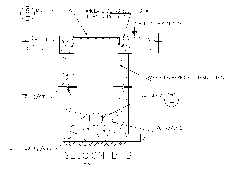 Section view of the structures is given in this Autocad drawing model. Channel detail is given. Wall internal surface, frame and anchor, frame and covers and payment level is mentioned in this drawing file. For more details download the Autocad drawing file. Thank you for downloading Autocad drawing files and other CAD program files from our website.