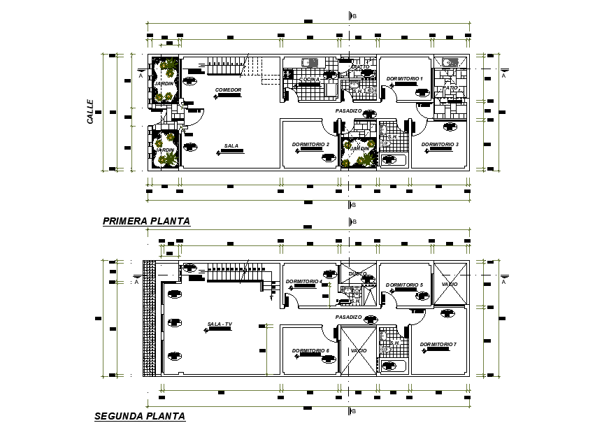 18x7m house plan is given in this Autocad drawing file. In this plan 7 bedrooms are available. In the ground floor living area, kitchen, dining area, common toilet, furniture details, and master bedroom with attached toilet, garden and two guest rooms are available. In the first floor master bedroom with attached toilet, three guest room, common toilet and living area are available. For more details download the Autocad drawing file. Thank you for the Autocad drawing file and other CAD program files from our website.