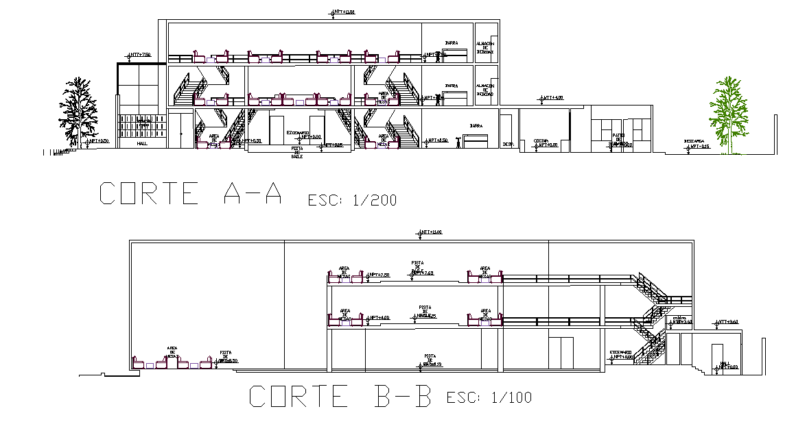 Section Of Huge Modern Shopping Center With Basic Rendered Drawing defined in this AutoCAD File. this is the modern elevation of a big shopping center with the simple color combination, its three side elevation of the building and one section, it's a glass facade design and this is the DWG file format.