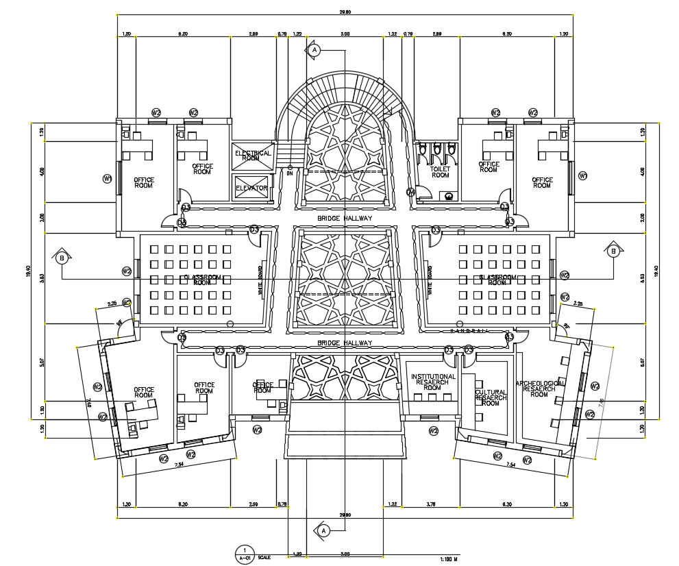 the architecture corporate office ground floor plan AutoCAD drawing that shows cultural room, archeological office, and institutional research room, office work desk, and toilet detail. also has center line plan with dimension detail. Thank you for downloading the AutoCAD file and other CAD program from our website.