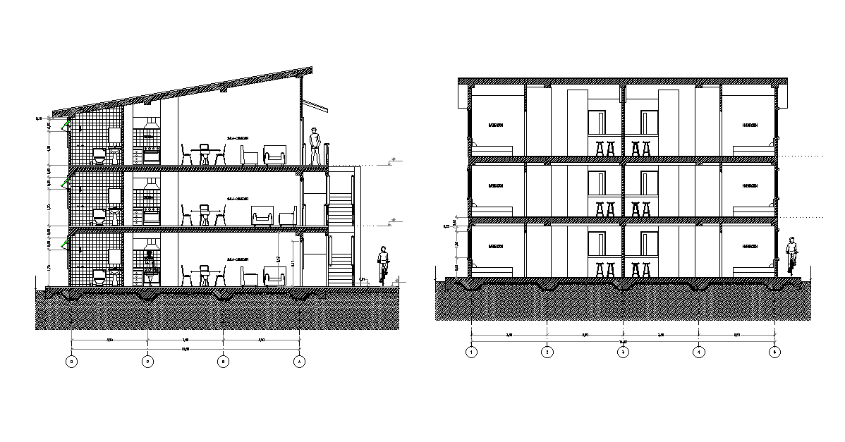 The restaurant building section section drawing that shows front and side view detail. also has RCC slab, flooring, wall section, and center line detail. Thank you for downloading the AutoCAD file and other CAD program from our website.