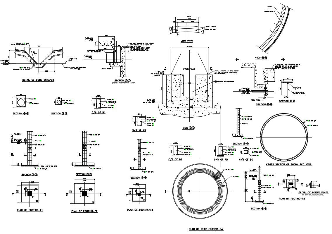 the industrial plant water tank construction CAD drawing that shows column footing foundation section and plan drawing, the detail of cone scraper set all baffle anchor bolts on radial line start here spacing with outlet launder and tank rcc wall. Thank you for downloading the AutoCAD file and other CAD program from our website.