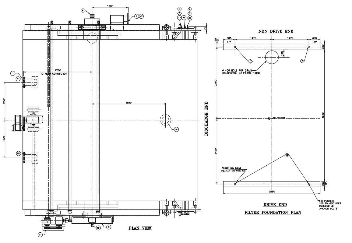 the industrial plant filter building foundation plan CAD drawings that shows 400 hole for drain connection at filter floor, 16000 kgs load equally distributed to feed connection detail. Thank you for downloading the AutoCAD file and other CAD program from our website.