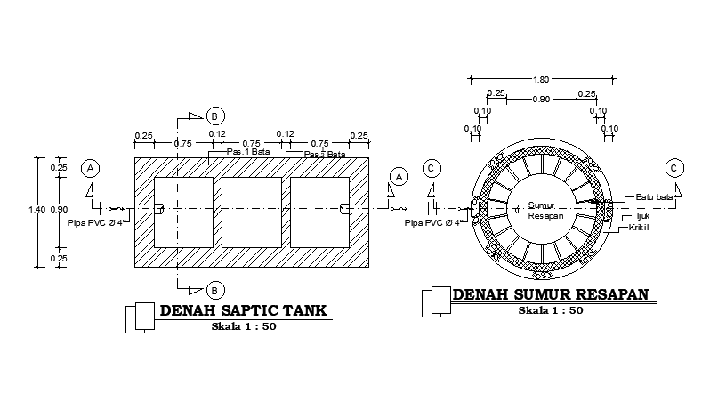 Denah septic tank detail is presented in this Autocad drawing file. in this file, denah sumur resapan and A ventilation hat are given. This drawing consists of the air gap, low cold water, tube lines, 2” PVC ventilation, and other details are given in this drawing model. Thank you for downloading the 2D Autocad files and other CAD program files from our website. Download this 2 d AutoCAD drawing file.