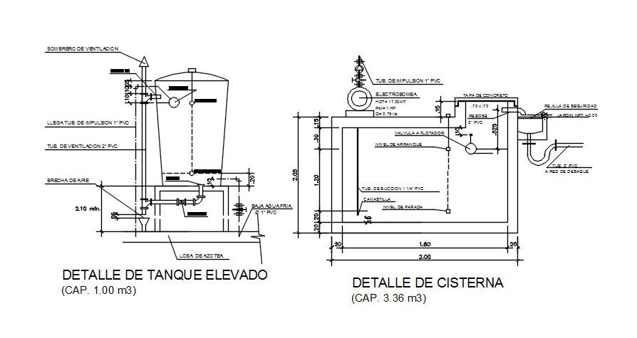 Elevated tank detail specified in this Autocad drawing file. A ventilation hat is given. This drawing consists of the air gap, low cold water, tube lines, 2” PVC ventilation, and other details are given in this drawing model. Thank you for downloading the 2D Autocad files and other CAD program files from our website.