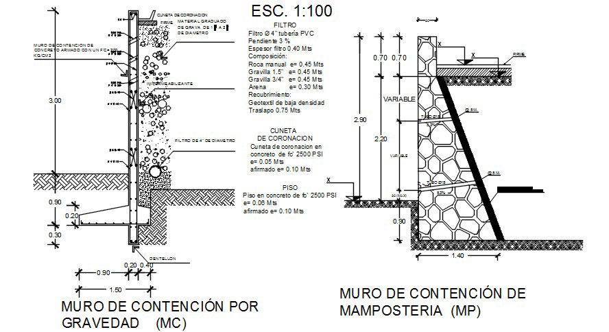 Gravity retaining wall detail drawing provided in this AutoCAD file. this drawing made by a 1:100 scale. this file consists of a separate view of the foundation detail drawing with detailed specifications of this file. this can be used by architects and engineers. Download this 2d AutoCAD drawing file.