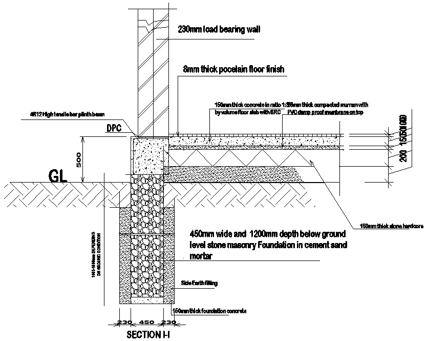 the plinth beam with foundation section CAD drawing that shows 230mm load bearing wall, 8mm thick porcelain floor finish, Side Earth filling, 450mm wide and 1200mm depth below ground level stone masonry Foundation in cement sand mortar and 150mm thick stone hardcore. Thank you for downloading the AutoCAD file and other CAD program from our website