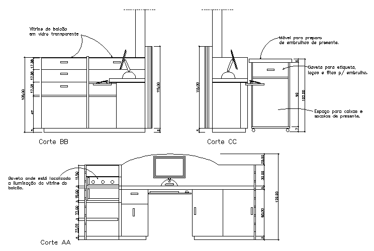the computer work desk furniture design sectional elevation front and side view that shows transparent glass counter showcase, furniture for preparing bill, label drawer, bows and ribbons for wrapping, space for gift boxes and bags, and drawer where the counter showcase lighting is located. Thank you for downloading the AutoCAD file and other CAD program from our website