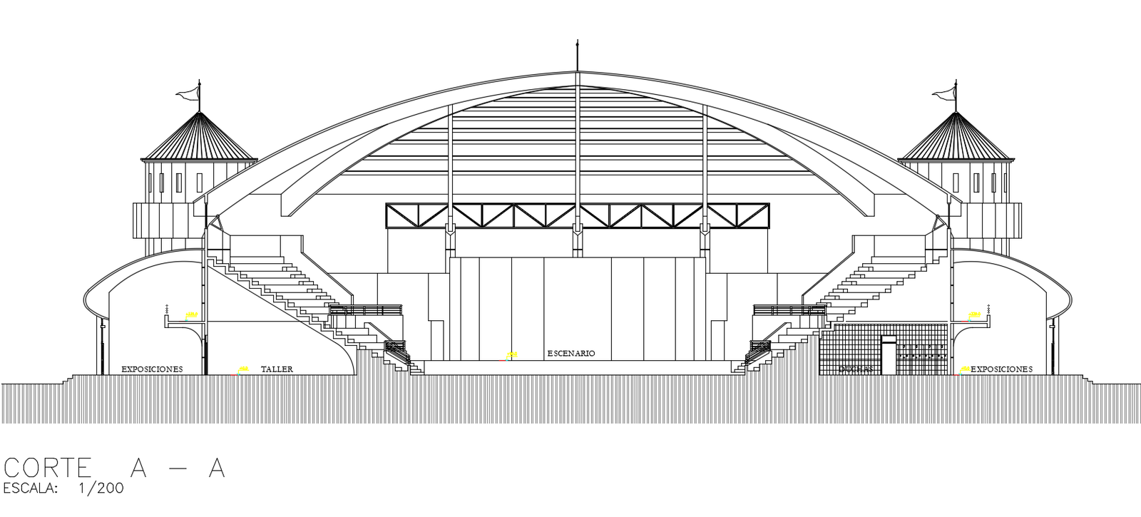the basketball stadium building CAD drawing shows front view sectional elevation design which consist exhibitions, workshop, stage, toilet, staircase, and span roof design. the total 60 meter breadth of plot and 20 meter height flooring to span roof building model design. Thank you for downloading the AutoCAD file and other CAD program from our website.