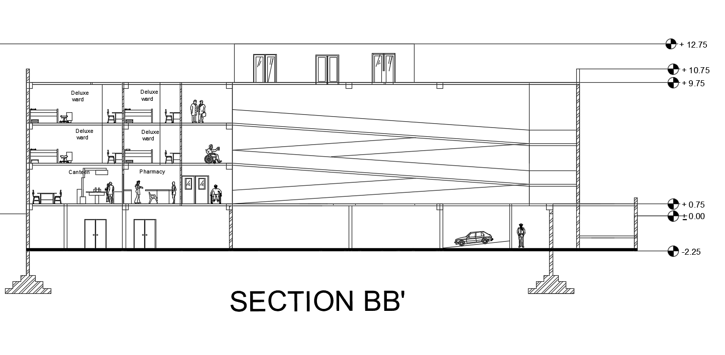 Hospital Building side section AutoCAD drawing that shows deluxe ward, semi-deluxe ward, nurses 'ward, pharmacy, canteen, physiotherapy section, general ward, pre operation theater, general ward and cross furniture section view detail. Thank you for downloading the AutoCAD file and other CAD program from our website.