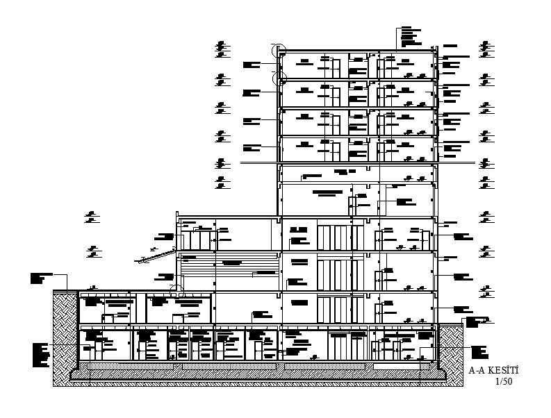 Section detail of the hotel building drawing derived in this AutoCAD file. Download this 2d AutoCAD drawing file.