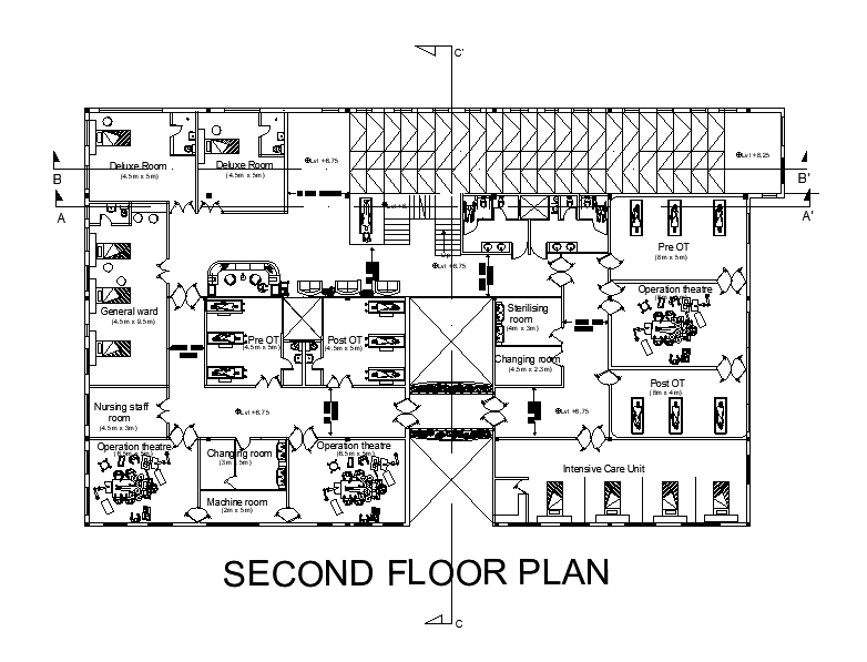the hospital second floor layout plan AutoCAD drawing includes furniture design that shows operation theater, sterilizing room, operation theatre, intensive care unit, deluxe room, semi deluxe room, general ward, nursing staff room, and toilet detail. Thank you for downloading the AutoCAD file and other CAD program from our website.