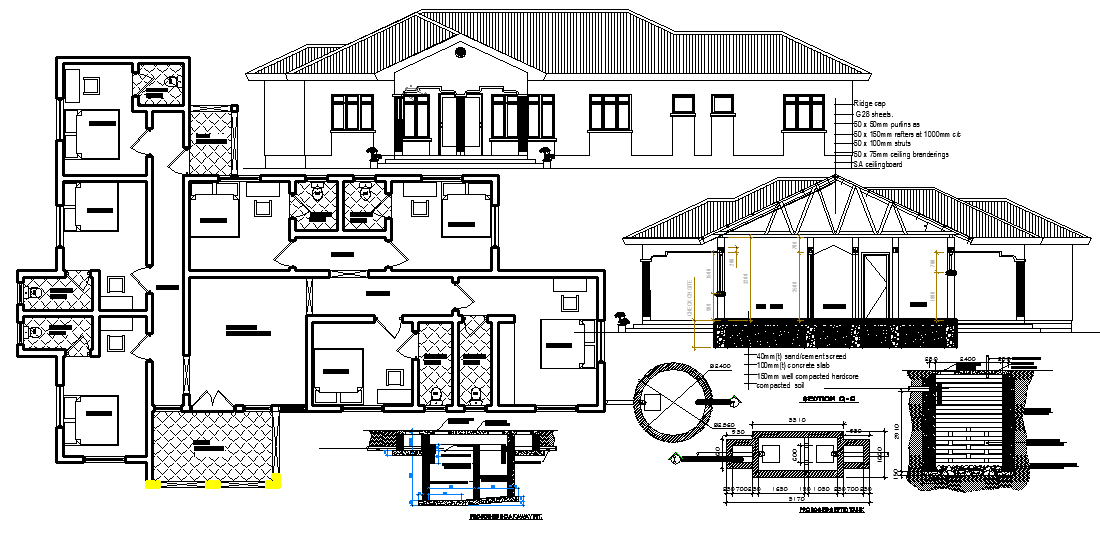 Farm house detail in lay-out & elevation detail.drainage detail with structure detail.