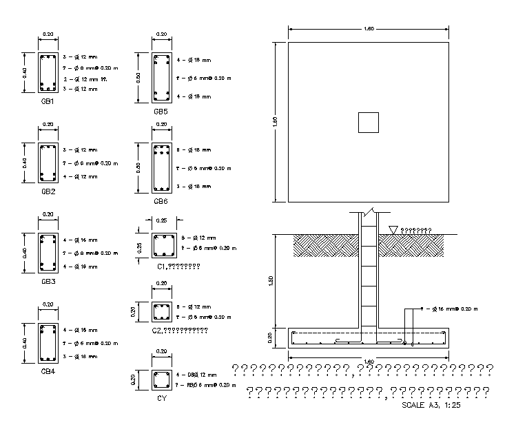 The RCC foundation plan and side section CAD drawing which includes foundation type expansion, E-beam extension, and the stanchion extension, pole of ground floor. there is 1.60X1.60 meter breadth and length, 0.20 mm thickness of foundation footing pad size. Thank you for downloading the AutoCAD file and other CAD program from our website.