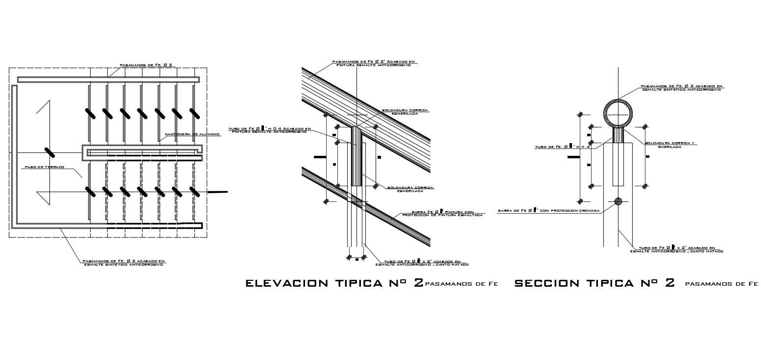 staircase with railing wall sectional elevation design AutoCAD drawing which includes handrail, finished in anti-corrosion synthetic enamel, terrazzo pitch, finished in anticorrosive enamel paint, aluminum butt plate, ground weld, and handrail and finished in anticorrosive synthetic enamel. Thank you for downloading the AutoCAD file and other CAD program from our website.